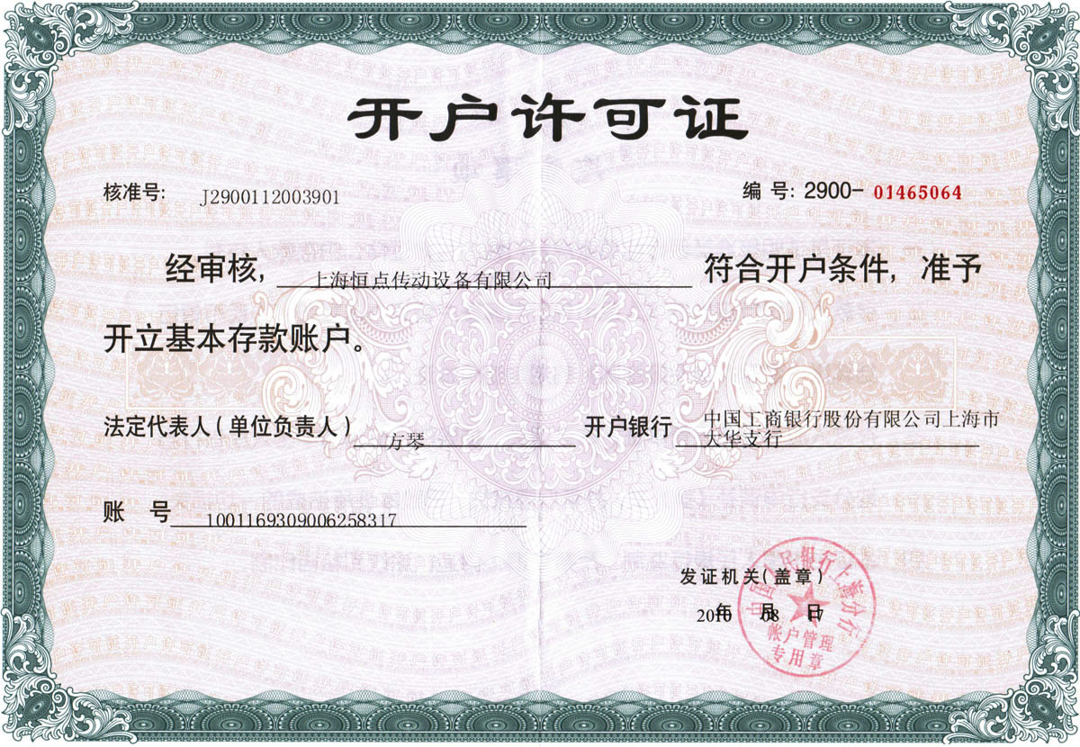 上海恒點減速機銀行開戶許可證