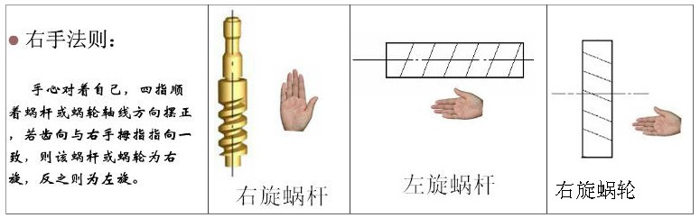 蝸輪蝸杆旋向是蝸輪蝸杆傳動的基本參數,分左旋和右旋 ,主要區别在於蝸輪蝸杆的旋轉方向,其中右旋蝸杆最爲常見,一副蝸輪蝸杆旋向的判斷方法可根據右手法則確認: