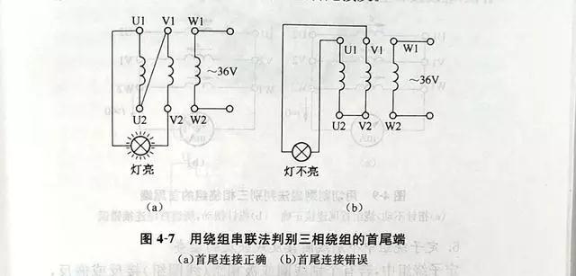 先用萬用表将繞組的6根引線分成3個獨立繞組,然後按圖4-7所示的接法通以低壓交流電(diàn)源(所加電(diàn)壓應使繞組中的電(diàn)流不超過額定值)。如果燈(dēng)泡發亮,則說明串聯的U、V兩相繞組是正向串聯。即一相繞組的首端接另一相繞組的尾端,如圖4-7(a)所示。如果燈(dēng)泡不亮,則說明是反向串聯 ,如圖4-7(b)所示。這時,可将一相繞組的首尾端對調再試。判斷出前兩相的首尾端後,将其中一相再與第三相串聯,用同樣方法實驗。最後,可以判斷出三相繞組各自的首尾端。