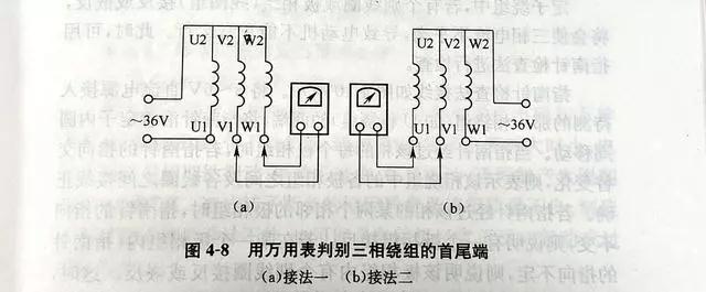 将三相繞組接成星形,從一相繞組接入36V交流電源,在另外兩相繞組的一端接入置於(yú)10V交流電壓擋的萬用表,按圖4-8(a)和(b)所示各接一次。 通電後,觀察萬用表指針的擺動情況 。若兩次萬用表指針均不動,則說明圖中所示的首尾端正確(què);若兩次萬用表指針都偏轉,則說明兩次均未接電源的那一相的首尾接反 ;若隻有一次指針偏轉,另一次指針不動,則說明指針不動的那一次中接電源的那一相首尾接反。
