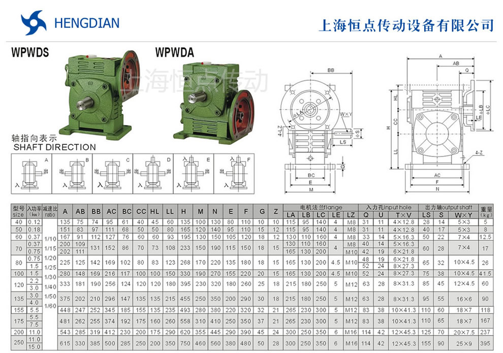 WPWDS與WPWDA系列萬能型蝸輪蝸杆減速機選型指南,WPWDS與WPWDA萬能型減速機軸指向表示方法.機座号40到250,速比10到60.WPWDS與WPWDA減速機的外形尺寸及安裝尺寸